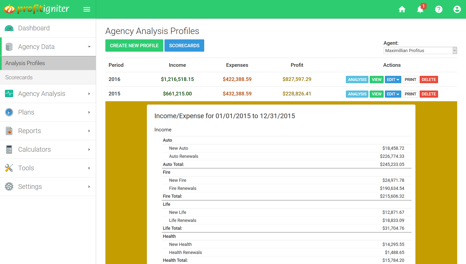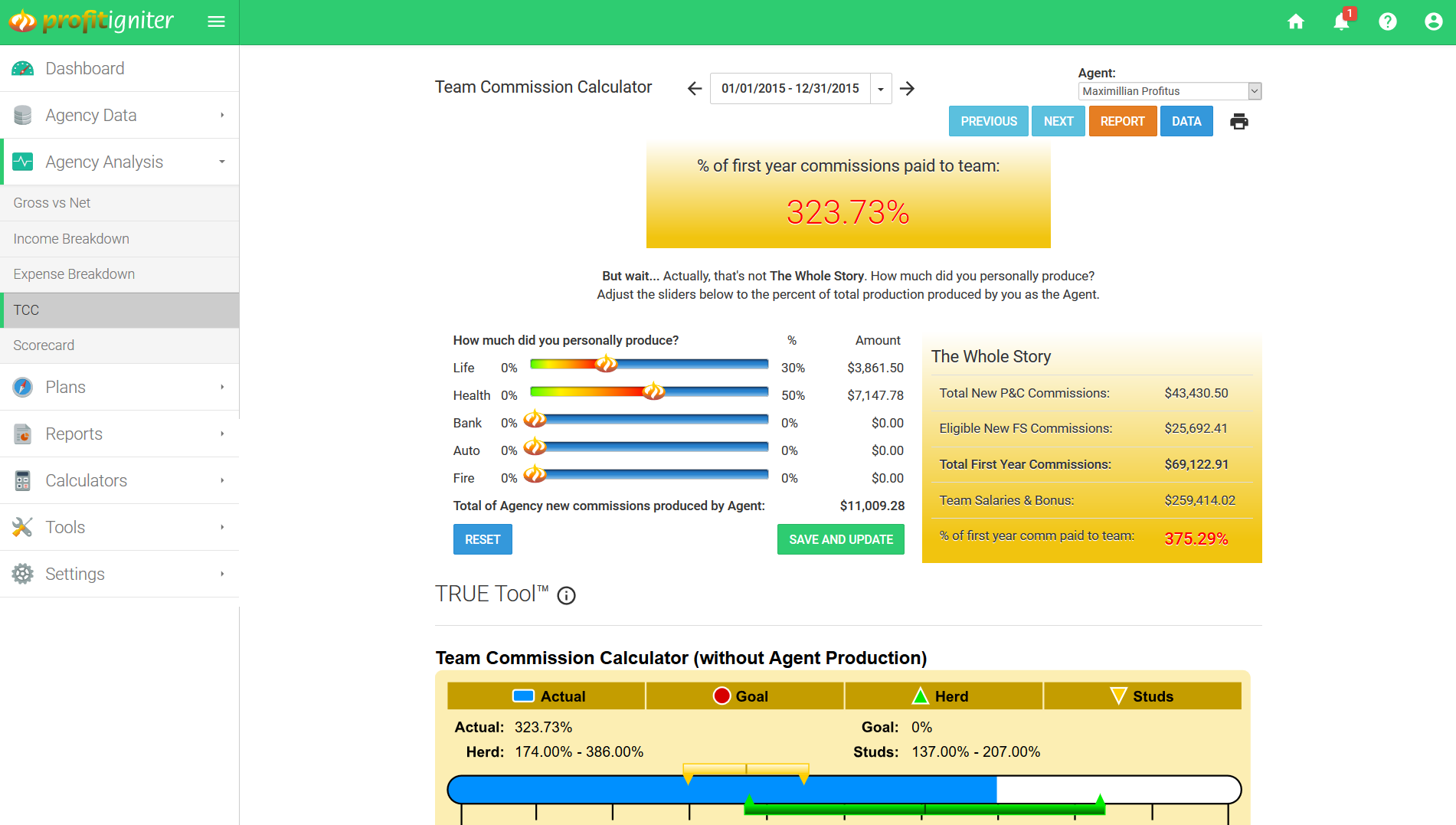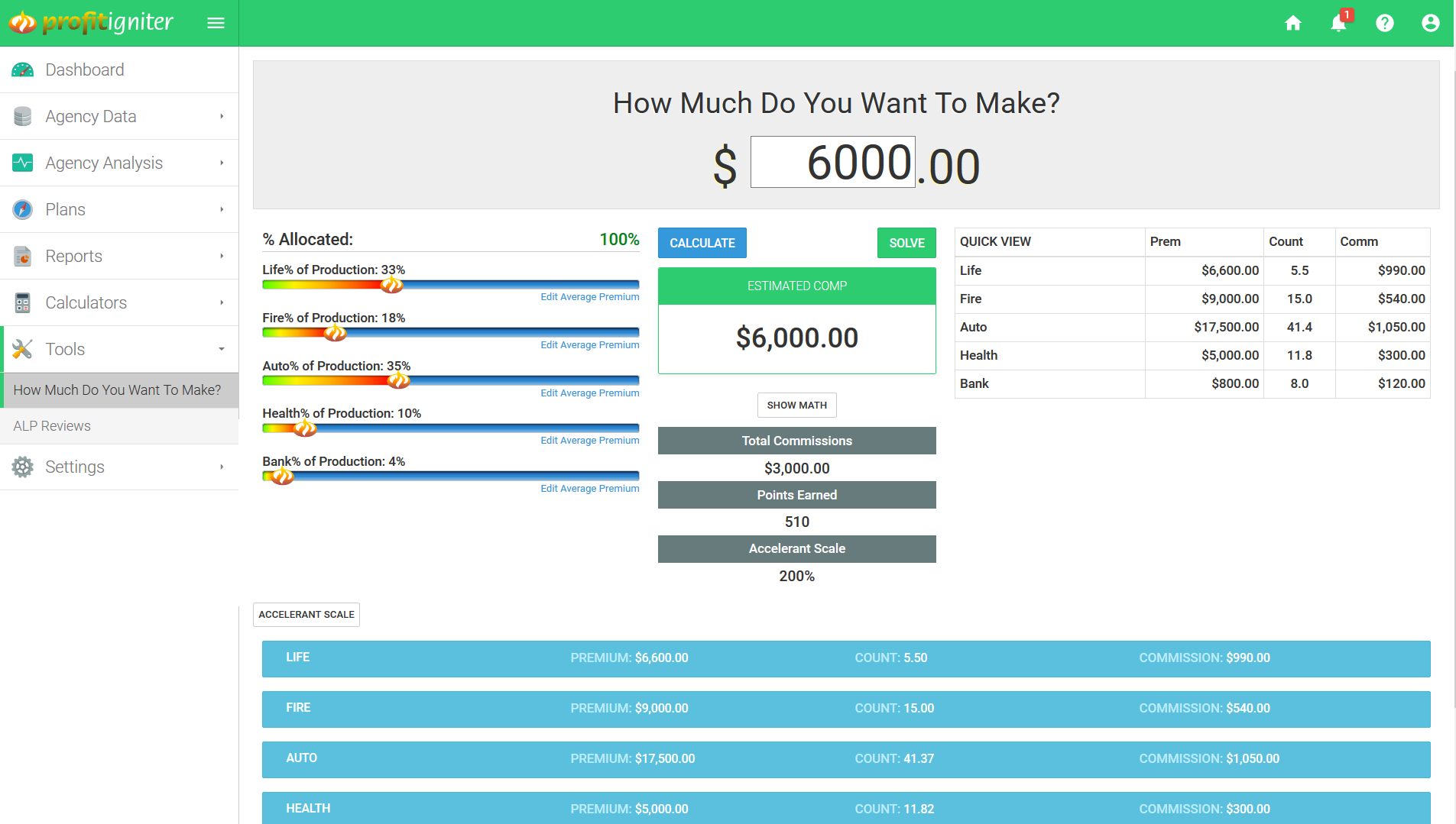 The ProfitIgniter software contains many robust business analysis features. With it you have the ability to conduct real-time Agency Analysis, build comprehensive business plans, design and build PayIgniter Comp Plans based on your business plan on the fly, and access the full suite of powerful profitability calculators.