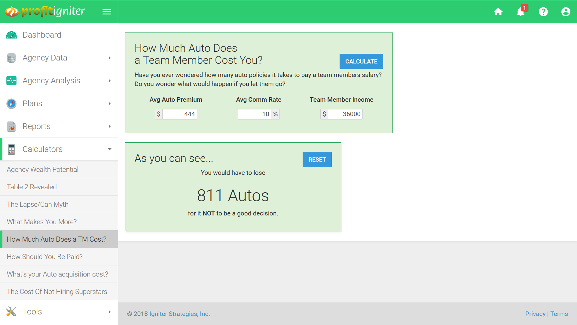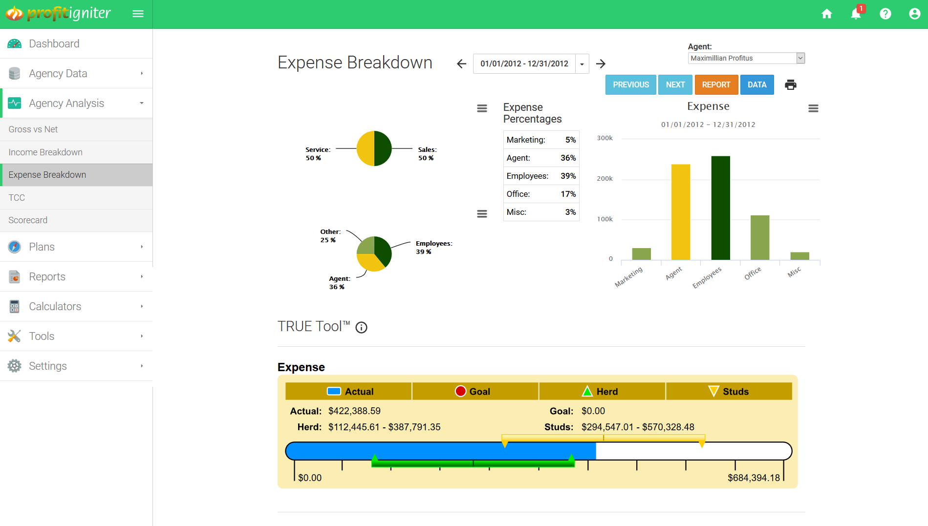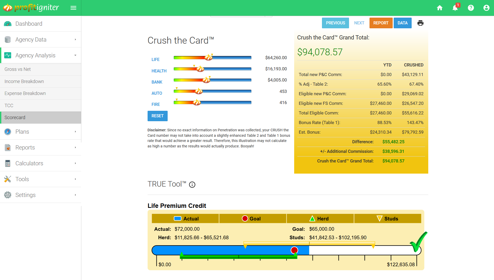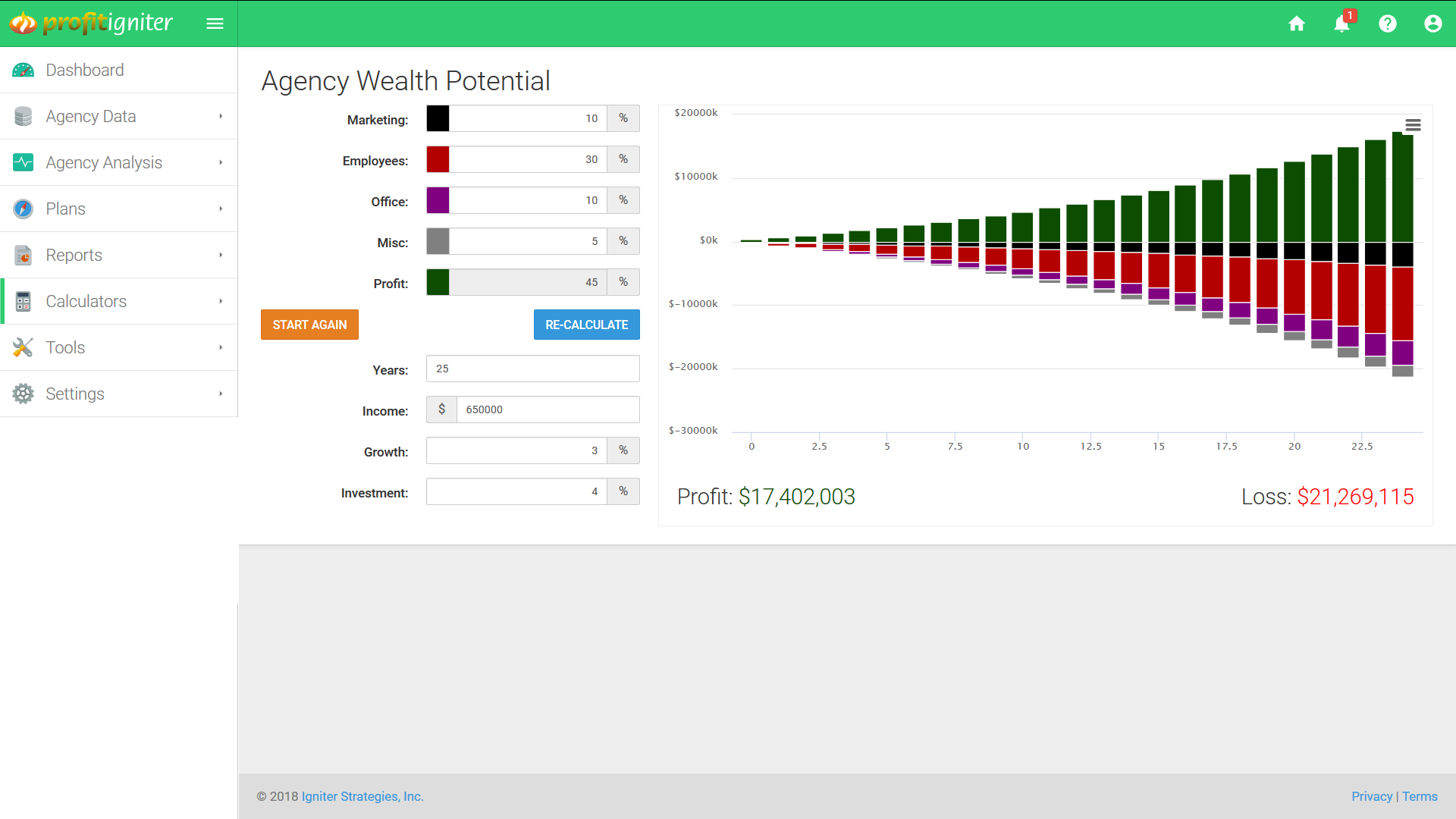 The ProfitIgniter software contains many robust business analysis features. With it you have the ability to conduct real-time Agency Analysis, build comprehensive business plans, design and build PayIgniter Comp Plans based on your business plan on the fly, and access the full suite of powerful profitability calculators.